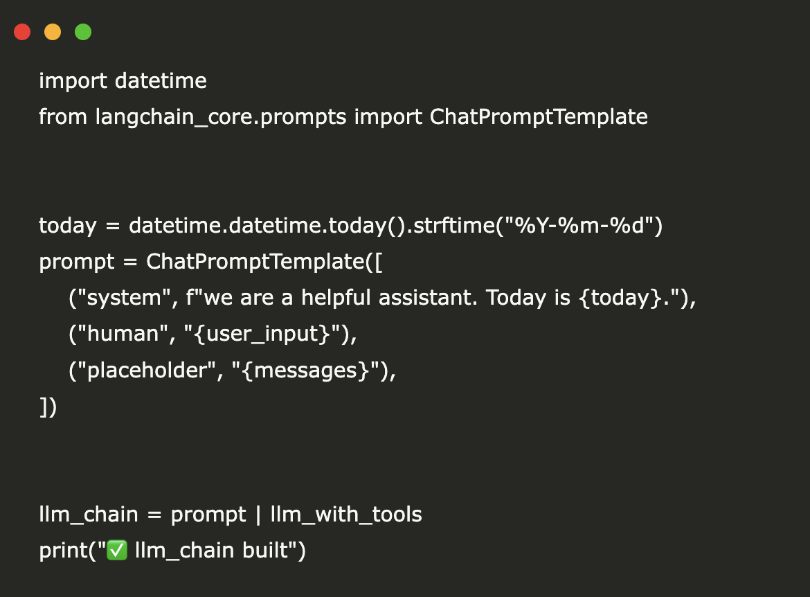 We build the conversational “chain” by first building a catflower chat that injects the current date into a system prompt and defines the locations for the user's entry and previous messages. By killing the model (|) in our llm_with_tools, we create an LLM_Chain which automatically formulates the prompts, invokes the LLM (with real -time research capacity) and manages the answers in a transparent workflow. The final printing confirms that the chain is ready to conduct end -to -end interactions.