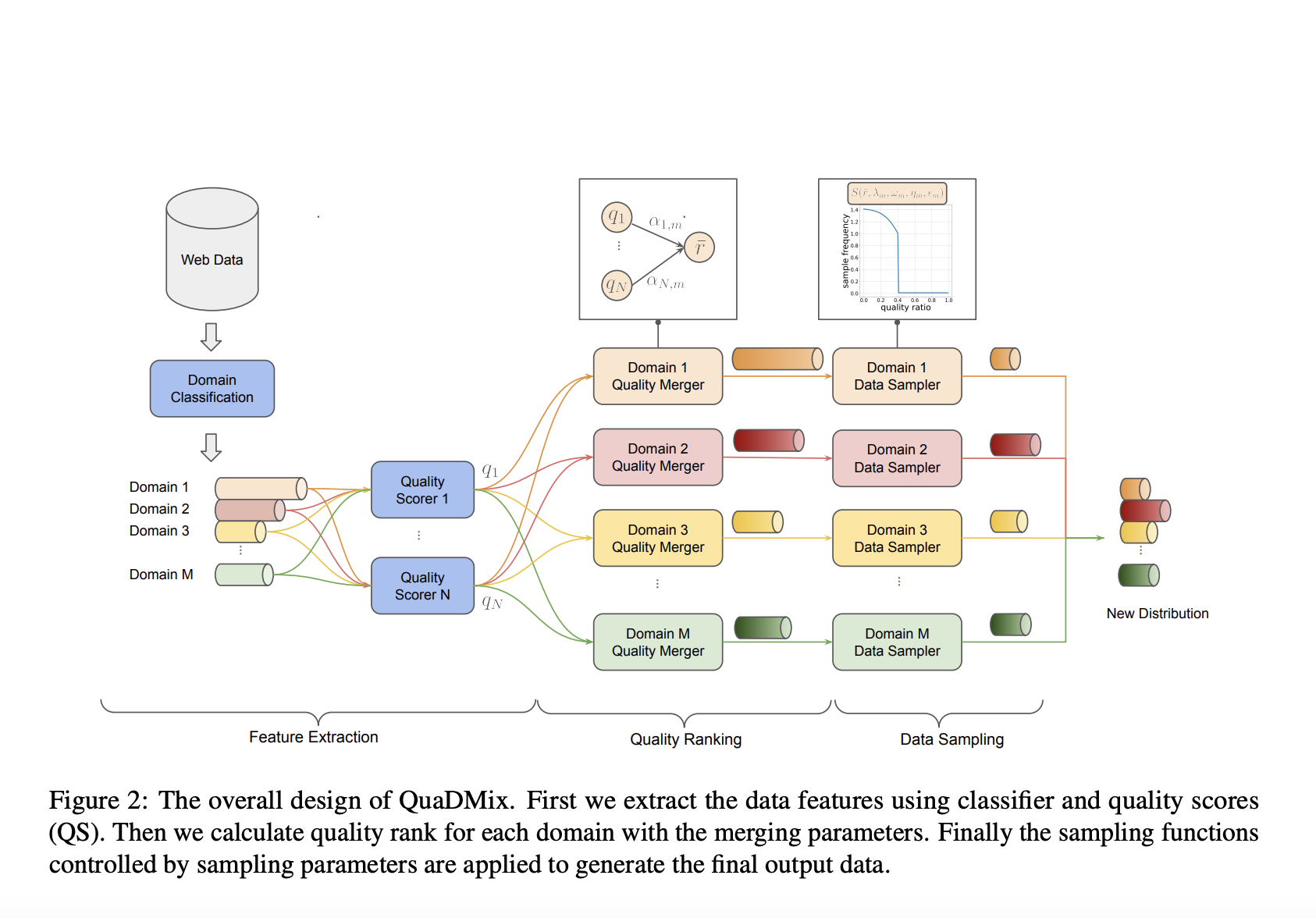 Quadmix works in three main steps: extraction of characteristics, quality aggregation and quality awareness sampling. Initially, each document is annotated with domain labels and multiple quality scores. These scores are standardized and merged using parameters specific to the domain to calculate an aggregated quality score. The documents are subsequently sampled according to a function based on Sigmoid which hierartes the better quality samples while maintaining the balance of the domain by configured controls.