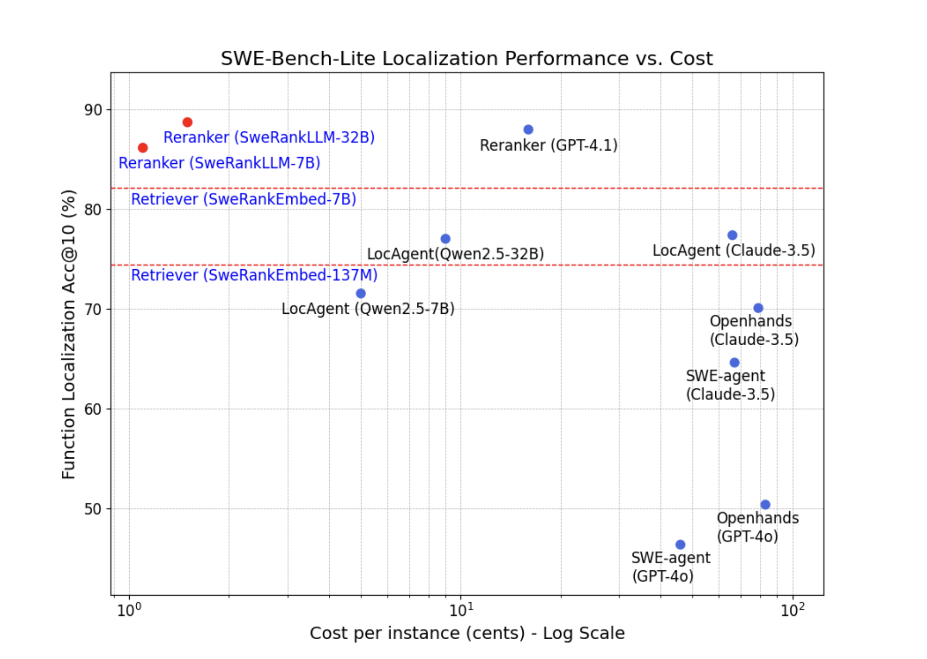 In addition to performance gains, Swerank offers substantial costs. Compared to the agents supplied by Claude, who on average $ 0.66 for exampleSwerankllm's inference cost is $ 0.011 For model 7B and $ 0.015 For 32B variant – edifying Up to 6x better precision / cost ratio. In addition, the Swerankembed 137 m parameter model obtains competitive results, demonstrating the scalability and efficiency of the framework even on light architectures.