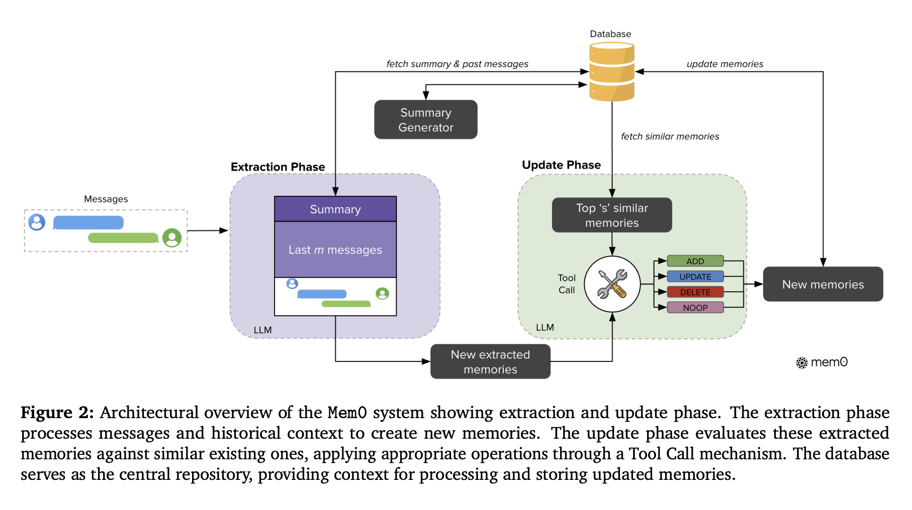 - MEM0 uses a two -step process to extract and manage salient conversation, combining recent messages and global summaries to form a contextual prompt.