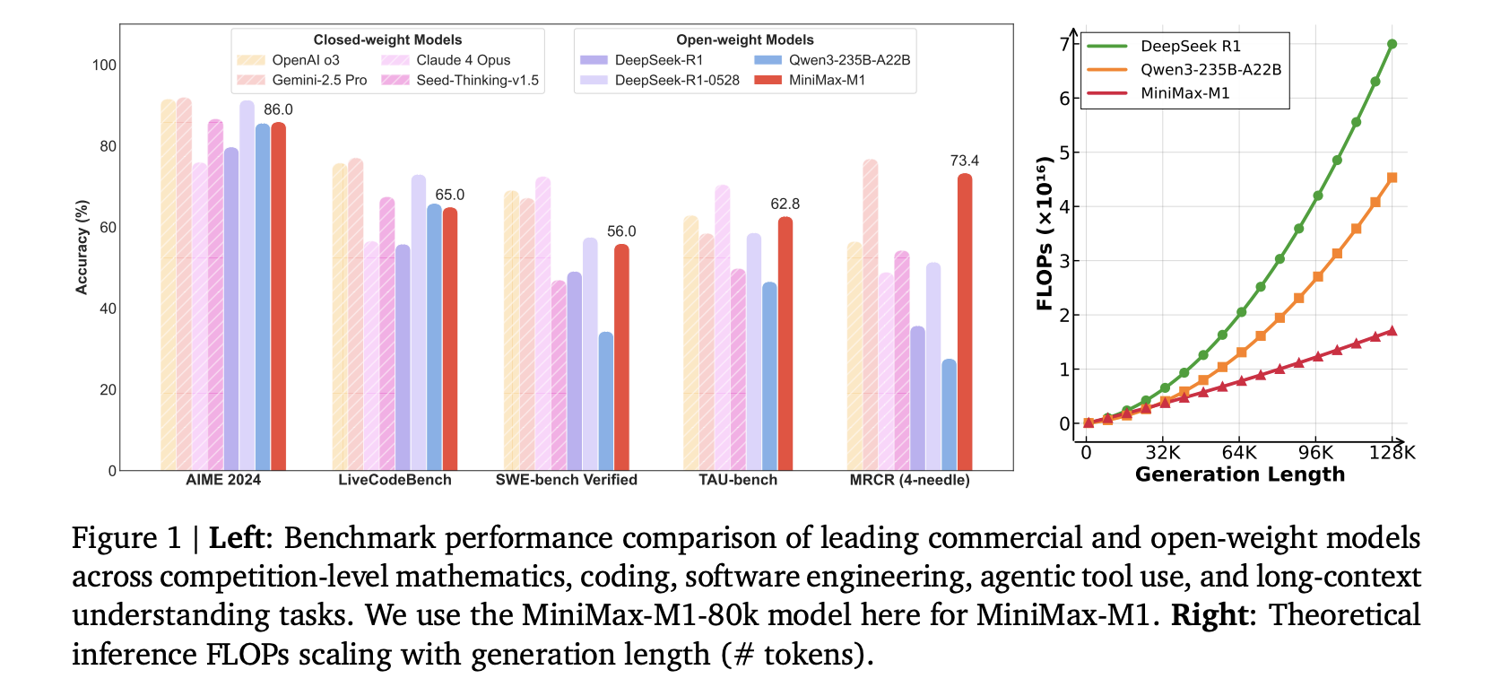 Minimax AI researchers have introduced Minimax-M1, a new large-scale model of reasoning on a large scale that combines a mixture of expert architecture with rapid attention. Built as an evolution of the minimum-text-01 model, Minimax-M1 contains 456 billion parameters, with 45.9 billion activated by token. It supports context durations up to 1 million tokens, eight times the capacity of Deepseek R1. This model deals with the scalability of calculation in inference time, consuming only 25% of the flops required by Deepseek R1 at 100,000 lengths of tokens production. It has been formed using large -scale strengthening learning on a wide range of tasks, mathematics and software engineering coding, marking an evolution towards practical and long -term models.