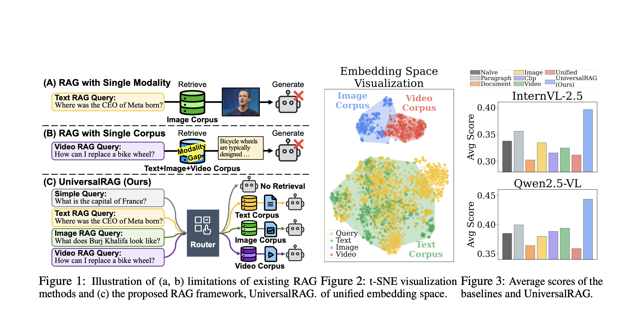 Researchers from Kaist and Deepauto.ai present Universalrag, a cloth frame that recovers and integrates knowledge from various sources specific to modality (text, image, video) and multiple levels of granularity. Unlike traditional approaches that integrate all the methods in a shared space, leading to a modality bias, Universalrag uses a routing mechanism dedicated to the modality to select the most relevant corpus dynamically based on the request. It also improves the accuracy of recovery by organizing each modality in corpus specific to granularity, such as paragraphs or video clips. Validated over eight multimodal benchmarks, Universalrag constantly surpasses the basic lines unified and specific to the modality, demonstrating its adaptability to various requests for a request.
