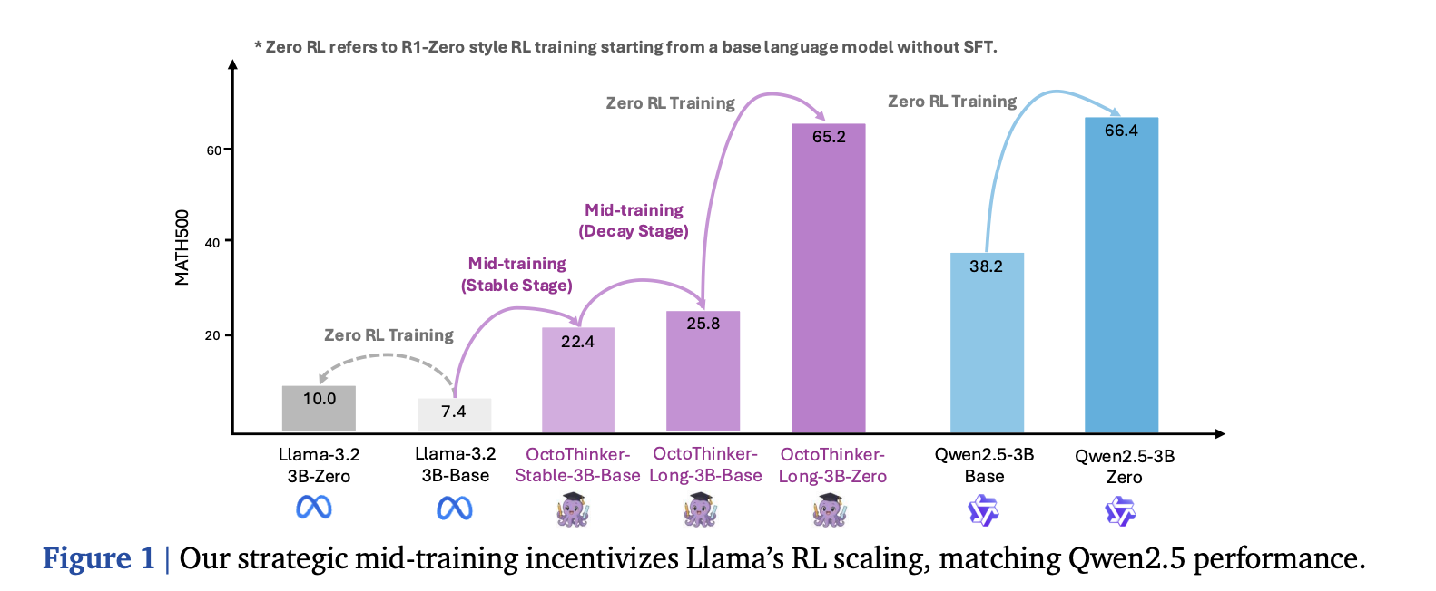 This article examines why basic models such as Llama and Qwen have divergent behaviors during the RL for reasoning, showing that half-training training plays a major role in the scalability of RL. The half-training training strategy in two stages transforms Llama into a foundation model better suited to RL, which leads to octothinker models. Future research orientations include: