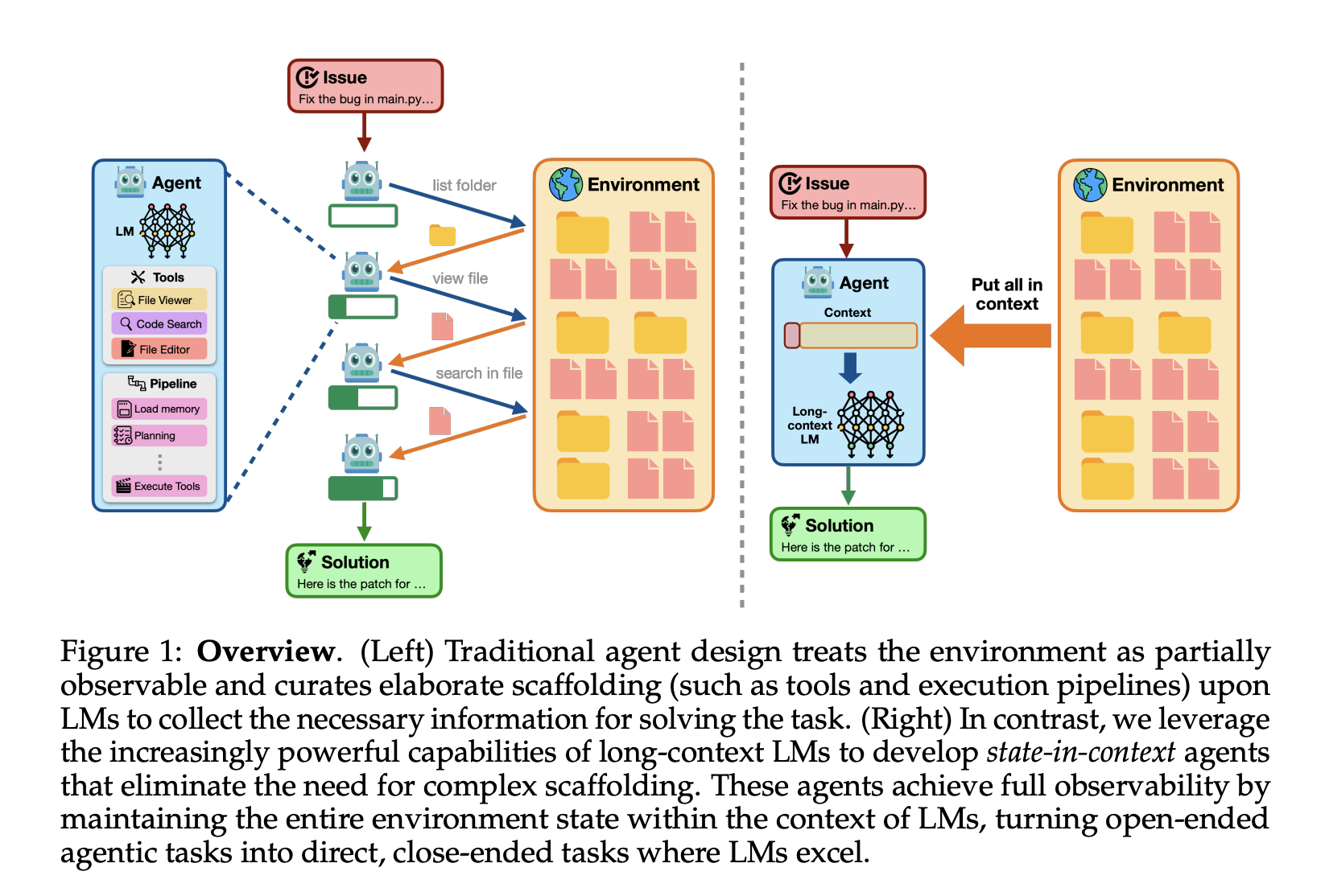 Traditional LM agents depend on interactive exploration due to partial observability, but many tasks, as the software debugged, allow complete observability. The study offers state agents in context that exploit LCLM to directly treat complete or compressed environmental states, bypassing the need for complex agent scaffolding. For large code bases, compression based on ranking selects relevant files to adapt within context limits. Two methods are introduced: directs, where LCLM resolves tasks using the full context; And select, where LCLM locates the relevant files for LM (SCLMS) with a short context to be resolved. Both use targeted patch formats and validation to ensure precision and reduce hallucination.