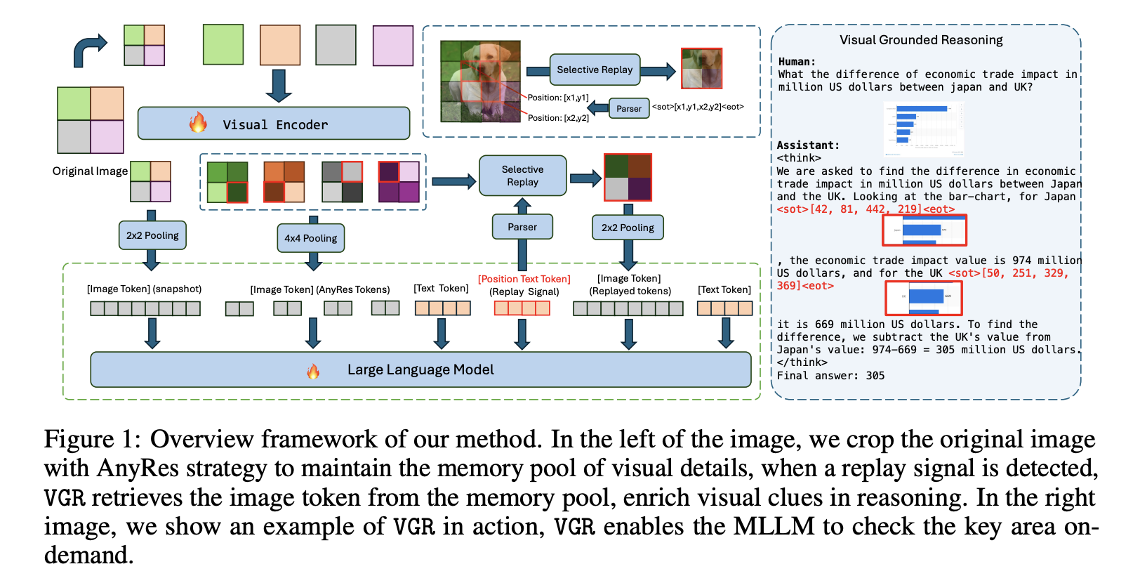 At the heart of VGR is a technique known as selective visual rereading. This feature allows the model to recover specific parts of an image whenever necessary. He uses a vision encoder to extract chips from image regions and stores them in a visual memory pool. During the reasoning, if the model meets a situation where visual information is necessary, it signals a replay and that the relevant image tokens are reintroduced in the reasoning flow. The system uses an Anyres strategy, expanding resolution support and reducing the use of tokens. Compared to the basic method, VGR only uses 144 tokens for image snapshots and 720 tokens for high resolution areas, a 70% reduction in total tokens. To train this capacity, the model is guided both by standard supervised learning and an auxiliary loss function that improves its ability to select and effectively interpret regions.