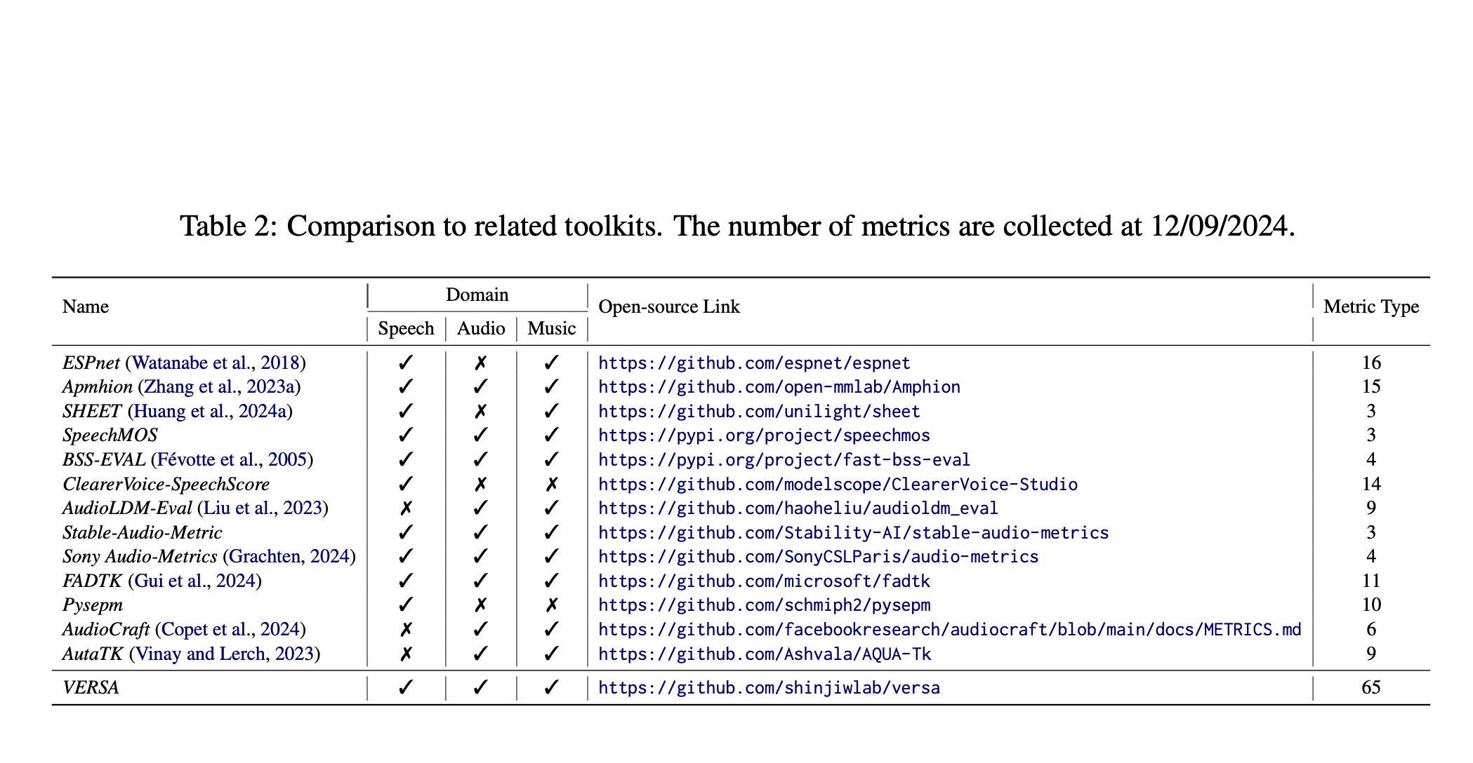 - Compared to 16 measures in ESPNET and 15 in amphion, the 65 metrics of Versa represent major progress.
