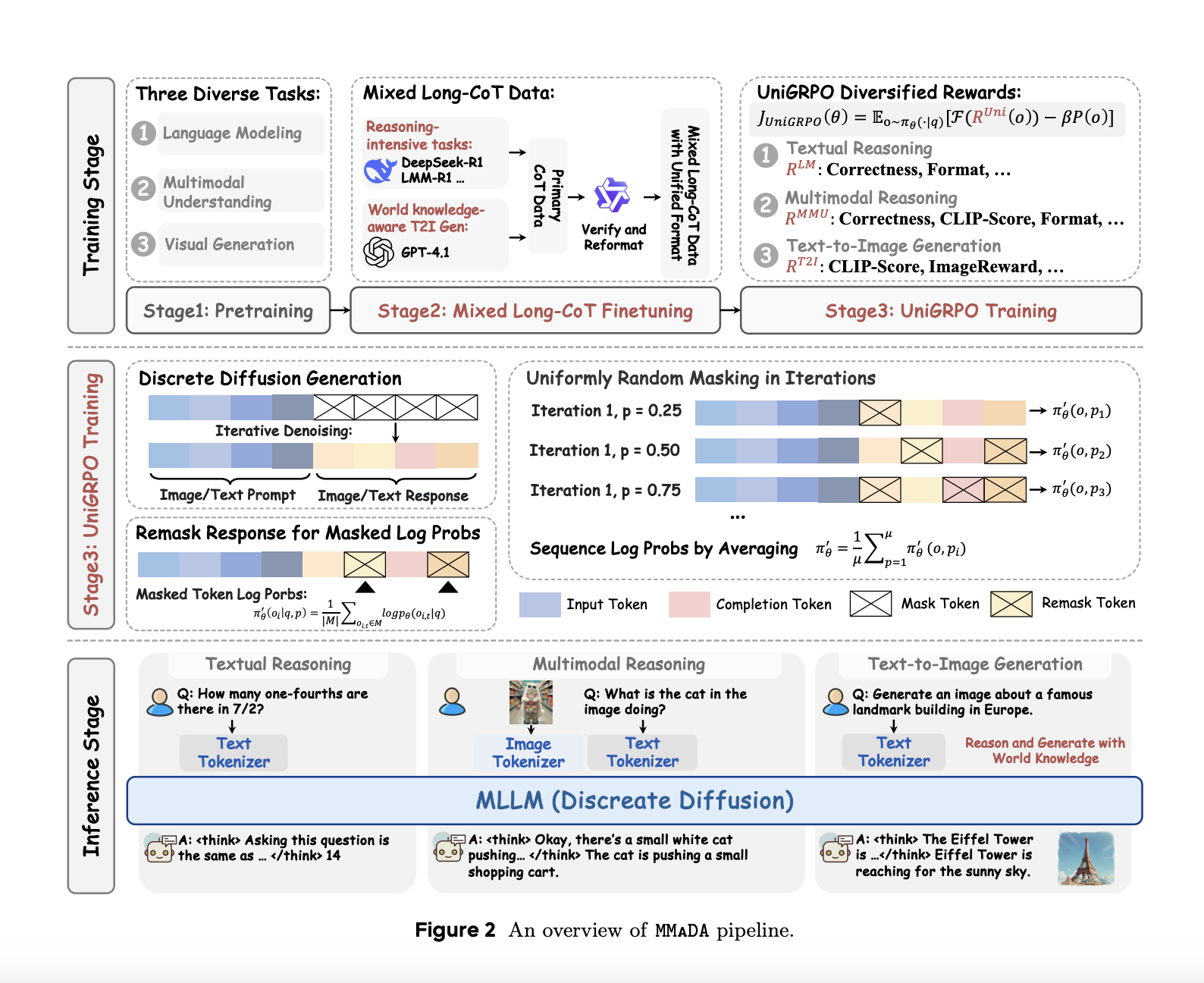 Researchers from Princeton University, the University of Beijing, Tsinghua University and Bytedance have introduced MMADA, a unified multimodal diffusion model. This system incorporates textual reasoning, visual understanding and the generation of images in a probabilistic framework. MMADA uses shared diffusion architecture without relying on components specific to modality, simplifying training on different types of data. The design of the model allows it to process textual and visual data together, allowing a rationalized and consistent coherent approach for reasoning and generation tasks.