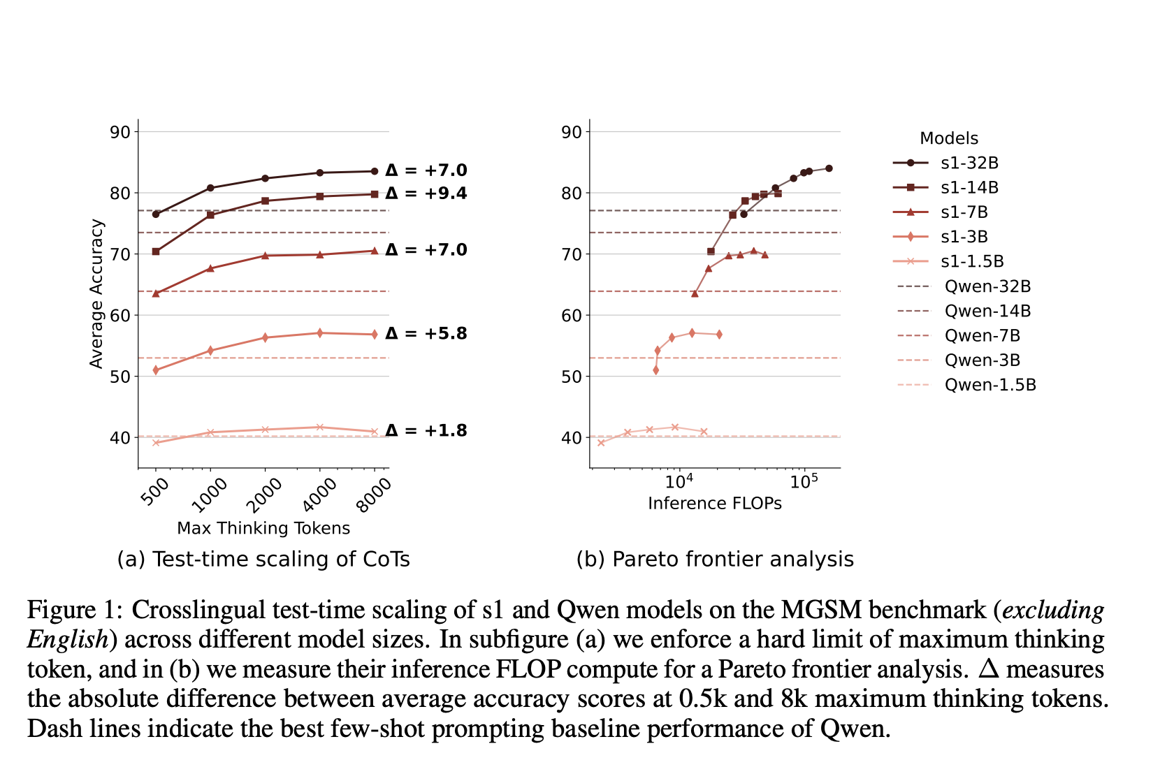 In -depth experiences have shown that models with more parameters benefit significantly from the increase in testing tokens in testing time. The 14B S1 model, when it is set at 8,000 reflection tokens, has reached an average precision of 81% in non -English -speaking languages in MGSM. He outperformed models like Qwen2.5-14b-instruct by + 23.1% in French and + 41.6% in Swahili. Even if the model was only formed in English, its performances have exceeded that of larger models such as R1-Distill-Qwen-32B of Deepseek in several languages with high resources. The study also revealed that reasoning in high -resource languages like Chinese and English is more effective, requiring fewer tokens and offering better results than in low -resource languages such as Swahili or Telugou.