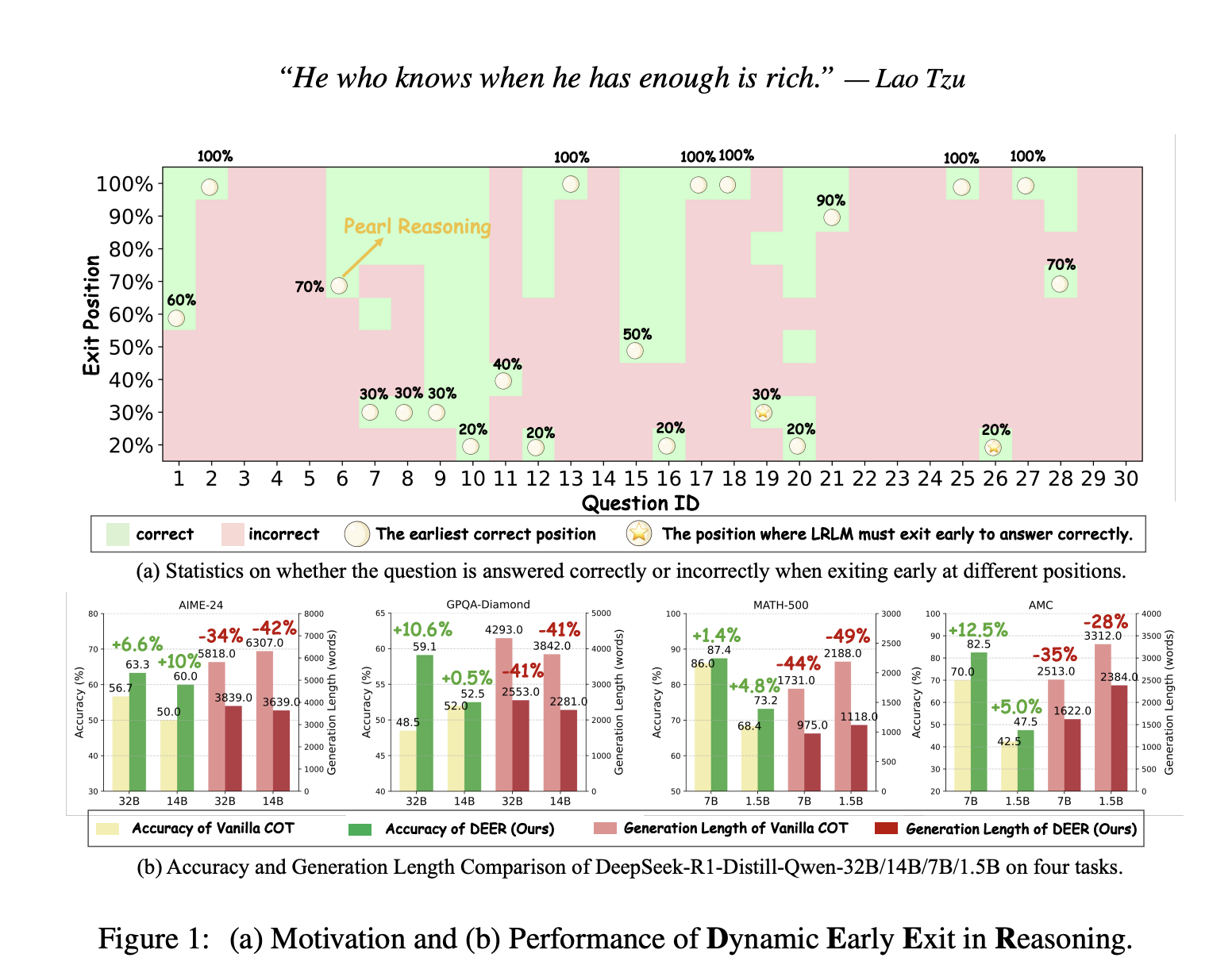 Researchers from the Institute of Information Engineering, the University of the Chinese Academy of Sciences and Technologies of Huawei proposed deer, a simple and without training method to allow the LRMM to leave dynamically early during reasoning. The deer monitors key transition points, such as the generation of “waiting” token, and invites the model to produce test responses at these moments. If the model shows great confidence, the reasoning is interrupted; Otherwise, it continues. This approach is transparently integrated into existing models, such as Deepseek, and reduces the length of the COT by 31 to 43%, while improving the precision of 1.7 to 5.7% between references, including Math-500, likes 2025 and GPQA Diamond.