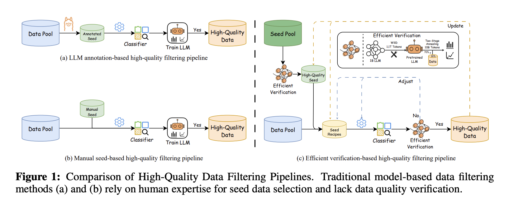 The study describes an efficient and high quality data filtering pipeline to reduce calculation costs while maintaining data integrity. It begins by using a profitable verification strategy to select reliable seed samples in a pool of candidates, which are then used to form a data classifier. The positive seeds come from LLM annotations, organized data games, manuals and synthesized content, while the negatives come from various corpus. The classifier training avoids over -rings, rather focusing on the selection of high quality seeds. A rapidly based classifier is used for scalable filtering, offering competitive performance with significantly lower inference costs compared to LLM -based methods, with pre -treatment steps guaranteeing a balanced and clean data input.