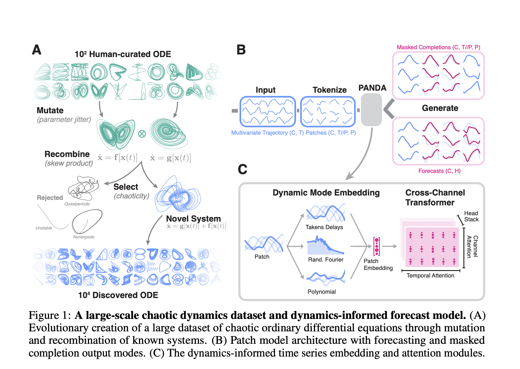 Researchers have generated 20,000 new chaotic systems using a genetic algorithm which evolves from an organized set of 135 known chaotic odes. These systems are mutated and recombined using an asymmetrical product approach, with only truly chaotic behaviors preserved by rigorous tests. Increases such as temporal incorporations and affine transformations widen the data set while preserving its dynamics. A separate set of 9,300 invisible systems is kept for zero shooting tests. The model, Panda, is built on Patchstt and improved with features such as the attention of the channels, the attention layers of time channels and dynamic incorporations using polynomial and Fourier characteristics, inspired by the theory of the Koopman operator.